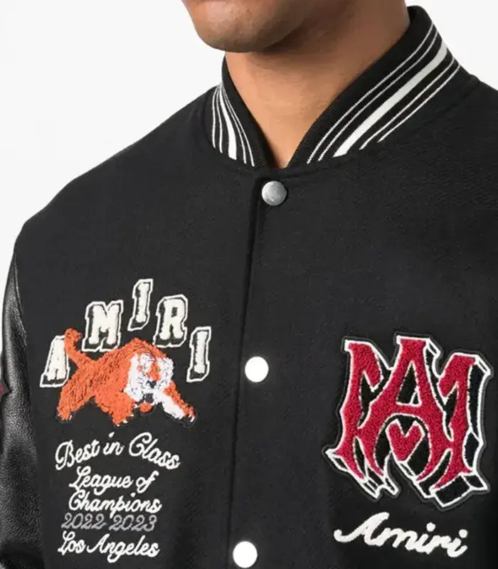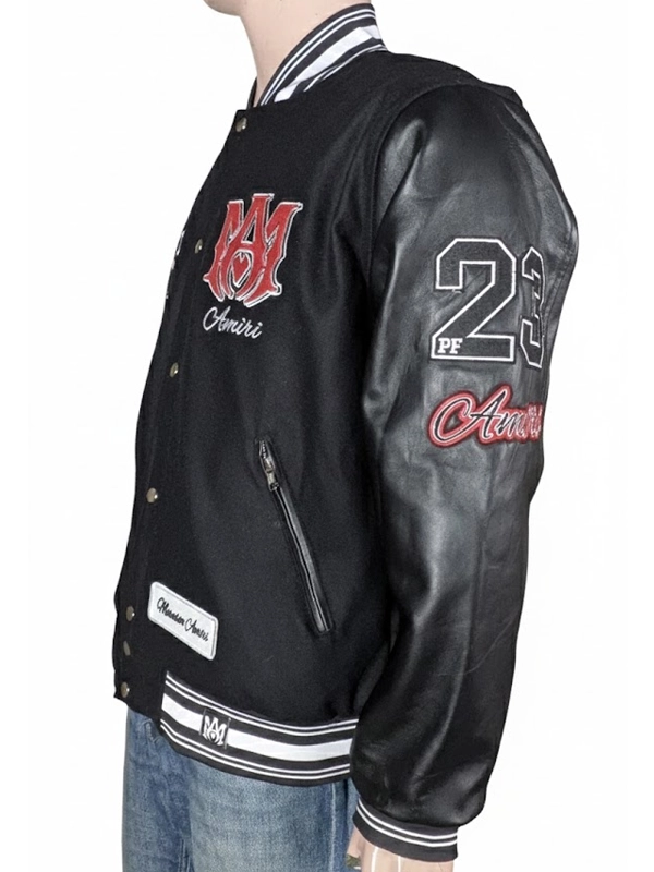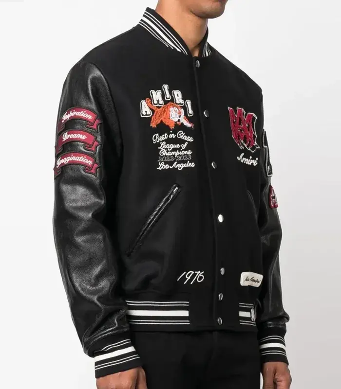 The Amiri Logo Patch Varsity Jacket is incredibly versatile. For an effortless “Off-Duty Rockstar” look, pair it with distressed denim and high-top sneakers. To lean into a cleaner, sophisticated vibe, style it over a minimalist black hoodie and tailored trousers. Whether you are navigating a high-stakes meeting or a casual weekend excursion, the bold patchwork and premium finish ensure your outfit remains polished and memorable.
