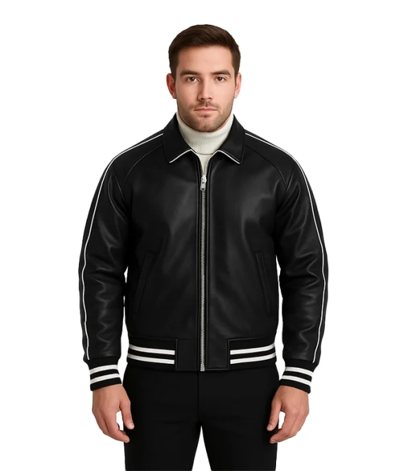 Engineered for velocity. The Retro Track Edition merges the DNA of a 1950s varsity jacket with the aerodynamics of a track jacket. We constructed the chassis from **Smooth-Grain Cowhide**, detailing it with **White Piping** that runs the full length of the arm. Unlike traditional snap-button varsities, this model features a central zipper and a structured leather collar, making it sharp enough for evening wear.