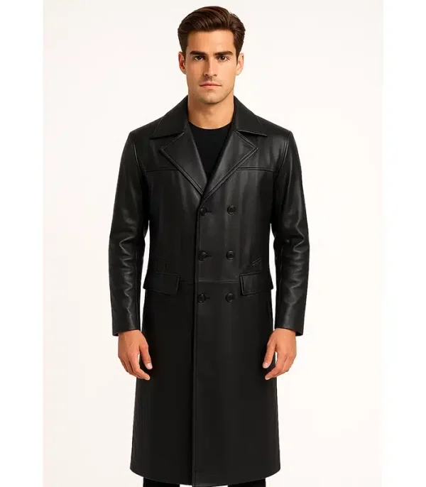 A long coat must hang straight. We use a **Heavy-Gauge Leather** (1.2mm) that resists wrinkling at the back of the knees. The coat falls in a clean vertical line from shoulder to hem, hiding any bulk underneath. For a belted, more adjustable fit, compare this with our Men’s Trench Coats.