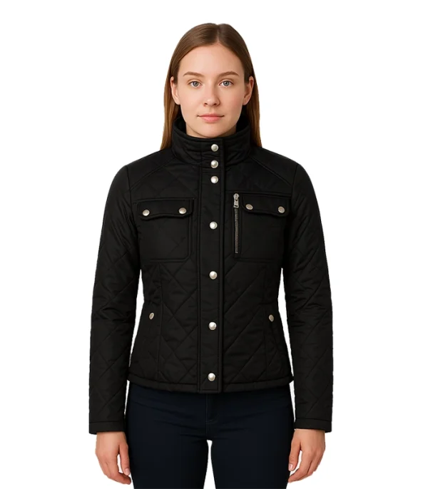 The Delphia Black Quilted Jacket for Women is designed for those who need warmth without the “puffy” weight of a winter parka. This is a technical shell. The thin, high-efficiency insulation is sewn directly into the diamond-stitch panels, ensuring the filling stays evenly distributed and never bunches at the hem.