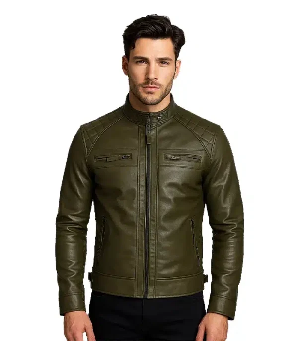 This Men’s Dark Green Racer Jacket is built for the man who wants to stand out without shouting. While black absorbs into the background, this **Olive Drab** tone commands attention. It works as a neutral, pairing easily with blue denim, grey chinos, or black boots, making it arguably more versatile than a standard brown jacket.
