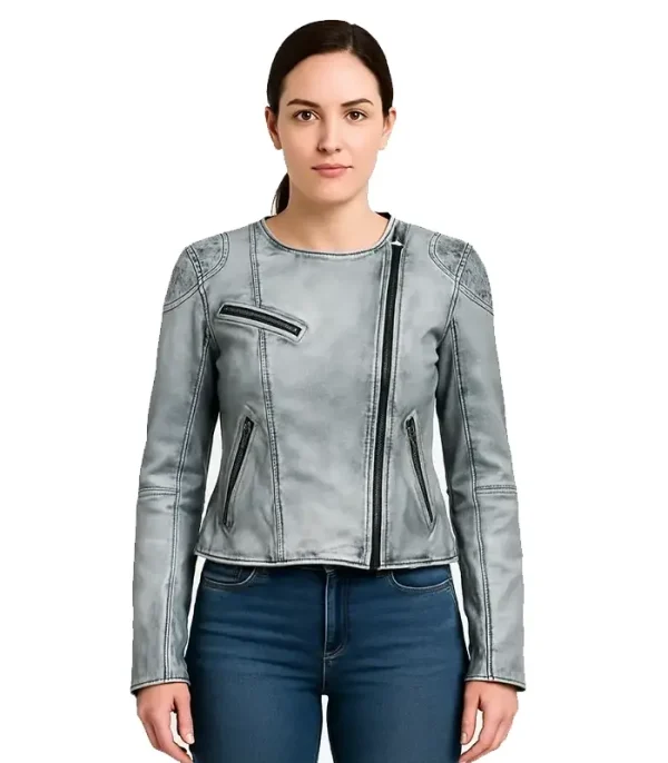 Verified Buyerthe collarless design and the quilted shoulders; it gives the jacket a sleek, feminine silhouette while keeping that rebellious moto edge