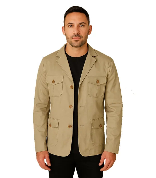 Engineered for the urban frontier. The Desert-Sand Expedition Shell reimagines heritage safari gear as a high-end technical layer. We constructed the chassis from Premium High-Density Desert-Sand Fabric, featuring a deep sand finish that maintains its warmth under natural light. The focal point is the symmetric quad-pocket utility—designed to provide secure, low-profile storage—complemented by structured notch lapels and adjustable buttoned cuffs for a sharp, modern profile.