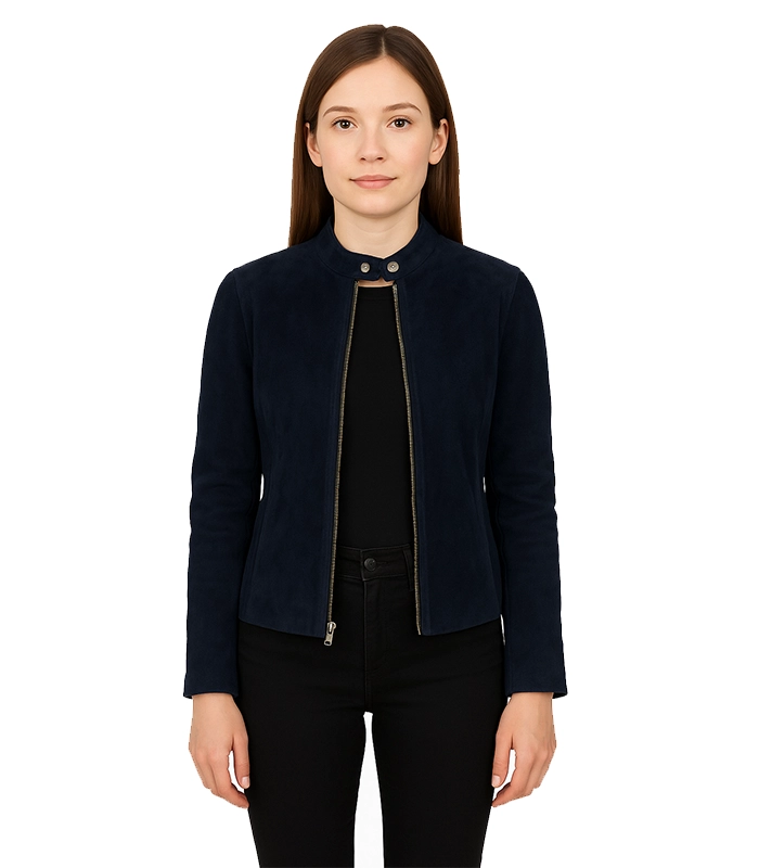 The Kelsee Navy Blue Suede Biker Jacket is designed for women who require a functional layer that commands respect through technical texture rather than aggressive hardware. Most navy jackets use thin, synthetic dyes; we engineered this piece with a high-saturation suede shell that maintains its structural integrity, ensuring the clean vertical profile stays sharp whether you are active or in a professional setting.