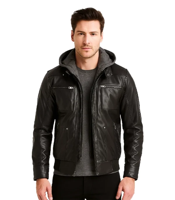 The Men’s Black Leather Bomber Jacket with Removable Hood is designed for men who require a functional layer that commands respect. Most bombers use thin, low-density materials; we engineered this piece with a heavyweight nappa shell that maintains its structural integrity, ensuring the profile stays sharp whether you are in transit or at rest.
