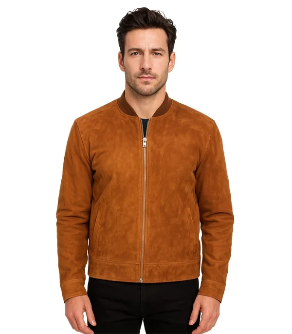 This Men’s Brown Suede Bomber Jacket is defined by what it lacks. We stripped away the zippers, snaps, and patches found on military jackets to create a pure silhouette. Zellberry uses a **High-Grade Goat Suede** which is lighter and softer than cowhide, allowing the jacket to drape naturally over a dress shirt without looking bulky.