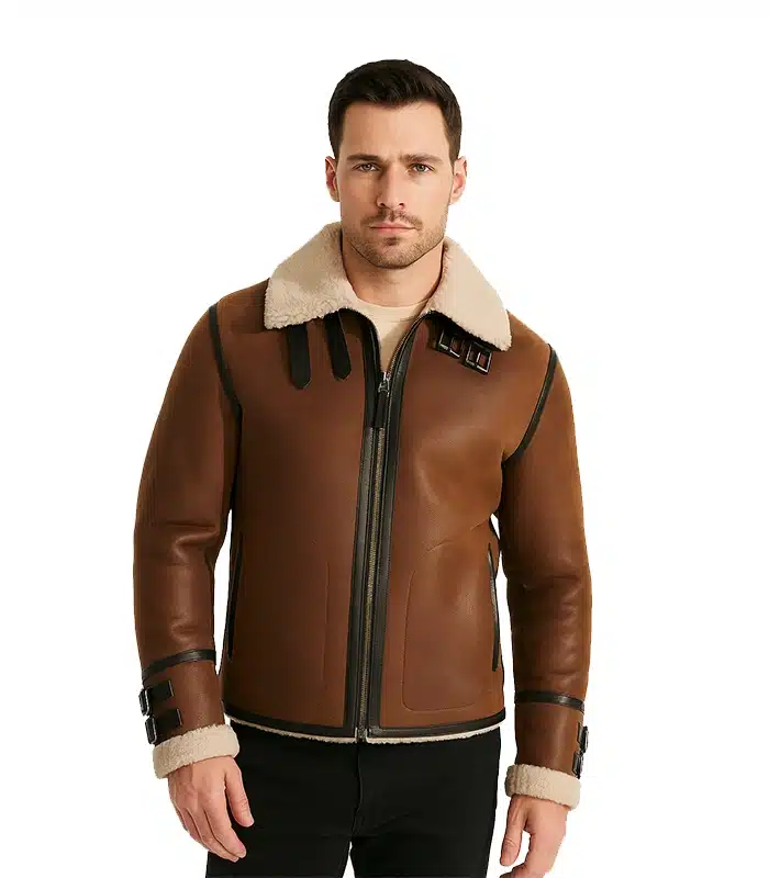 This Men’s Tan Shearling Bomber is designed for men who want the warmth of a B3 without the “Grandpa” look. By applying **Black Leather Straps** over the seams, zipper, and cuffs, we created a sharp graphic outline that frames the torso. This contrast detailing turns a vintage military piece into modern streetwear.