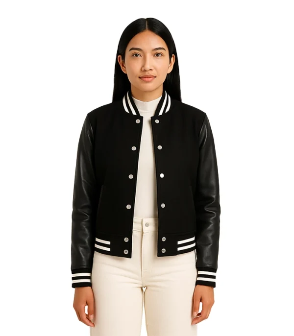 The Savant Black Hybrid Varsity Jacket is a precision-tailored athletic piece designed for women who demand sharp urban lines and material-driven craftsmanship. We built this chassis from a premium wool-blend core and real leather sleeves to provide a structural silhouette that performs as a definitive urban layer.