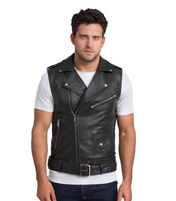 This Sullivan Black Leather Biker Vest features a Reinforced Asymmetrical Zip Matrix and traditional biker lapel articulation. We utilized high-density leather to ensure a superior vertical drape and installed an integrated waist-belt cinch for long-term industrial resilience and fit control.
