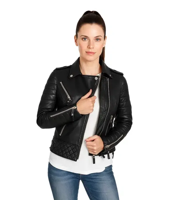 The Women’s Boda Style Quilted Leather Biker Jacket is built with reinforced stitching and a clean internal lining system. This setup ensures a secure core seal against the elements while maintaining a professional silhouette during urban transit. It offers a more structured, detailed look compared to the minimalist aesthetic of our Alabaster Diamond Moto Shield.