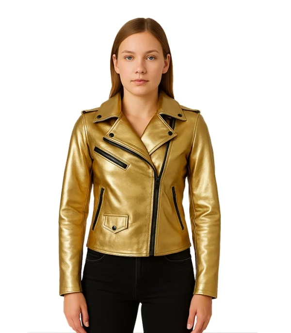Metallic Engineering: The Women’s Golden Zipper Motorcycle Leather Jacket