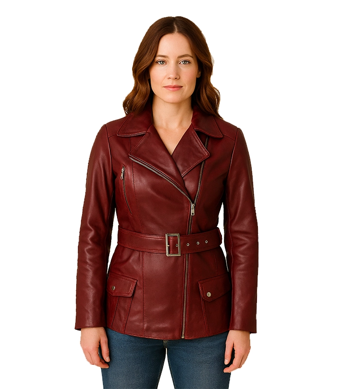 This Women’s Maroon Asymmetrical Real Leather Biker Jacket features unique Belted Waist Articulation and an industrial asymmetrical zip matrix. We utilized high-density leather with oversized notched lapels to ensure a superior vertical drape and reinforced the dual flap utility pockets for long-term industrial resilience.