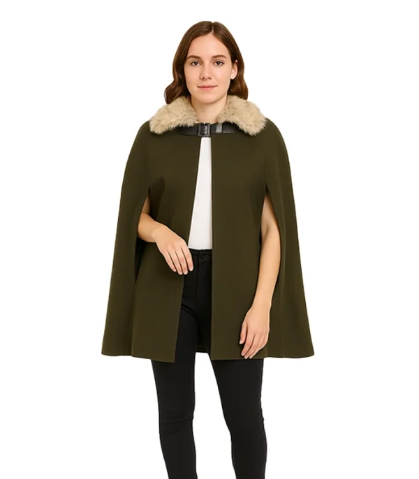 Women’s Olive Green Wool Cape Coat with Fur Collar